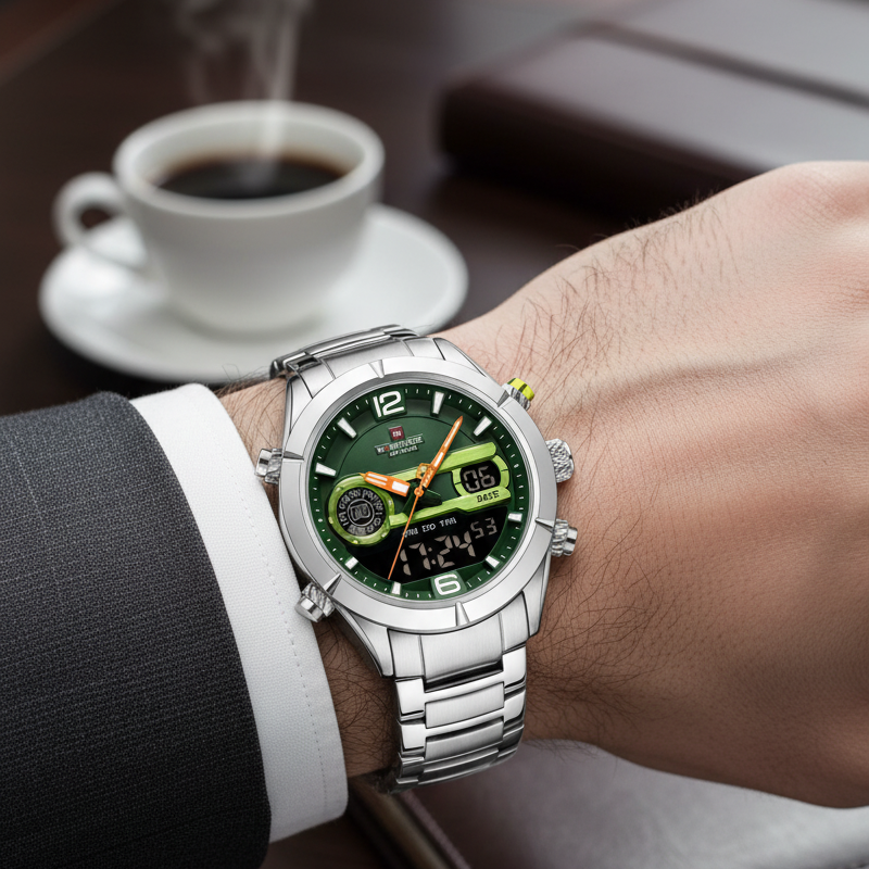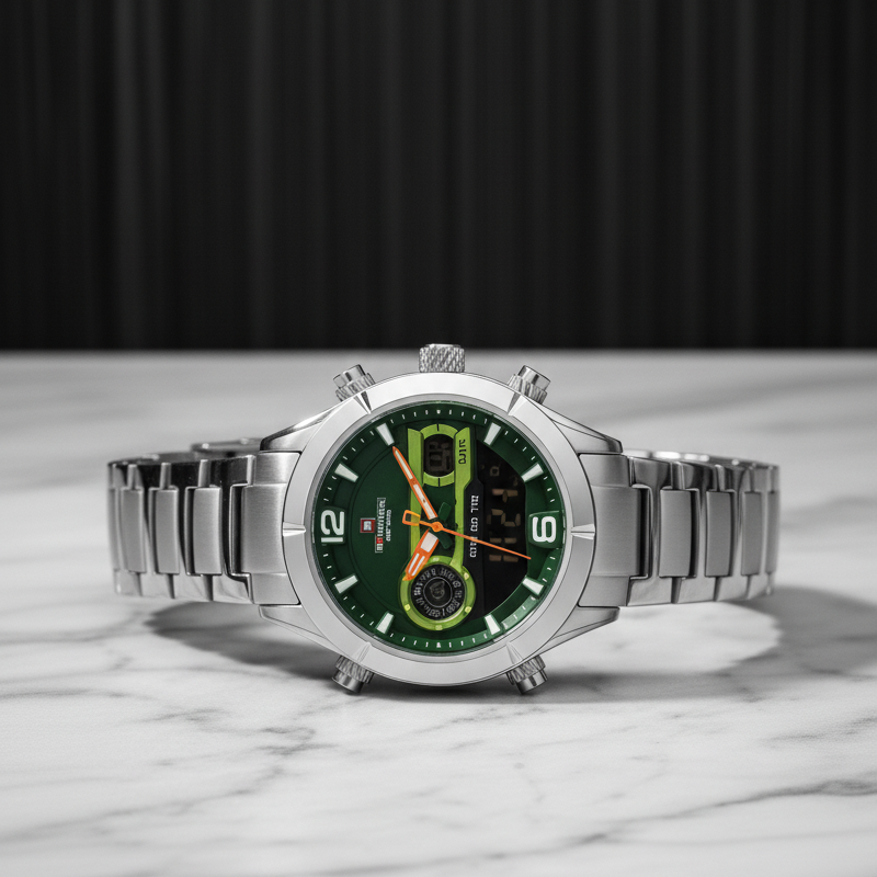 El Naviforce Arthon combina elegancia y funcionalidad en un diseño contemporáneo. Su estructura metálica y múltiples funciones lo convierten en el reloj ideal para el hombre moderno.