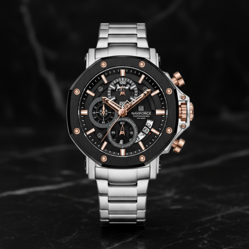 El Naviforce Asteron Steel es un reloj elegante para hombre con diseño premium en acero plateado, detalles en oro rosado y una esfera negra llena de carácter. Una pieza sofisticada para quienes buscan presencia y estilo.