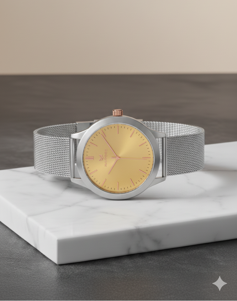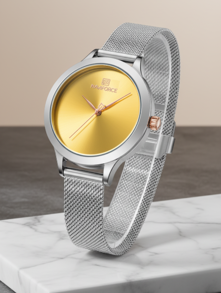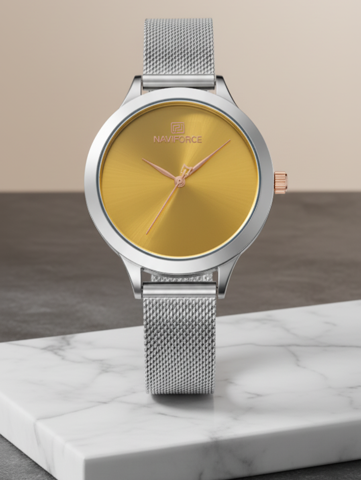 Naviforce Aura Mesh es un reloj elegante y minimalista diseñado para mujeres que buscan sofisticación en cada detalle. Su esfera dorada metálica crea un contraste moderno con la correa tipo malla de acero, logrando un look fino, limpio y femenino.