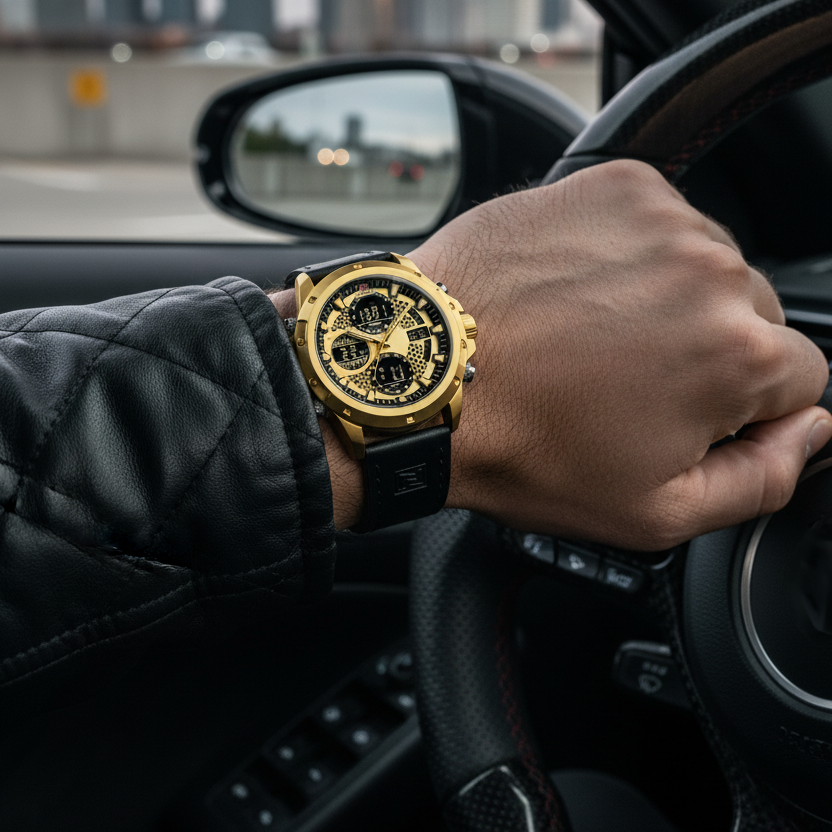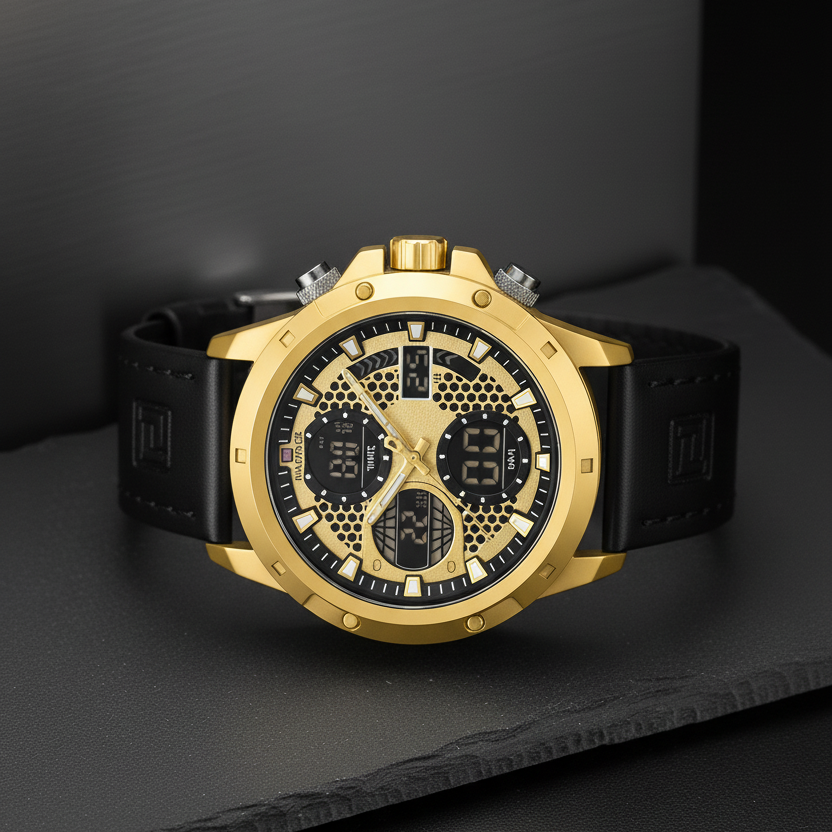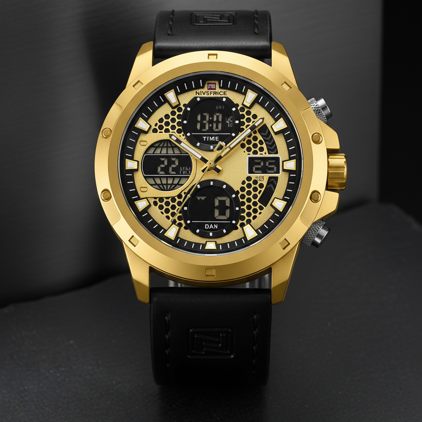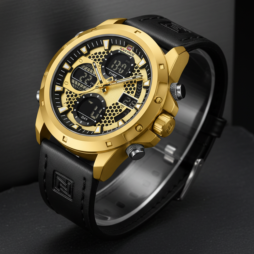 El Naviforce Aureus Hybrid combina elegancia y tecnología en un diseño imponente. Su caja dorada con textura metálica y correa de cuero negro proyectan estilo y carácter. Un reloj híbrido que une lo clásico con lo digital, pensado para hombres con presencia y precisión.