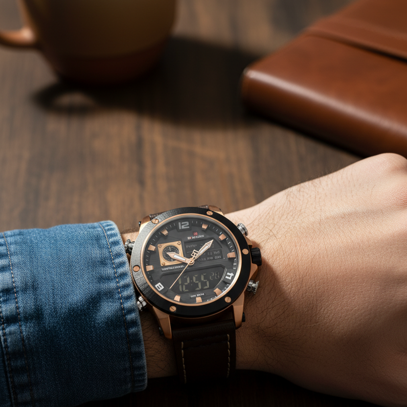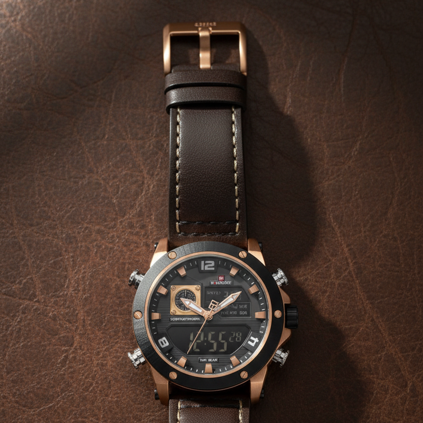 El Naviforce Bravion es un reloj casual de cuero diseñado para hombres que buscan estilo, presencia y funcionalidad en una sola pieza. Su estética robusta con pantalla híbrida lo hace ideal para uso diario con un toque sofisticado.