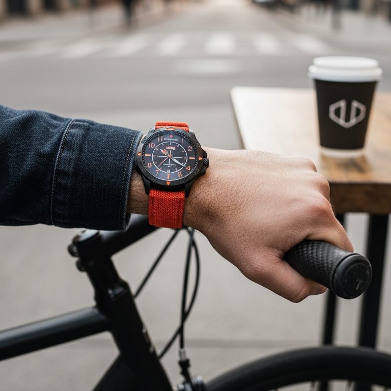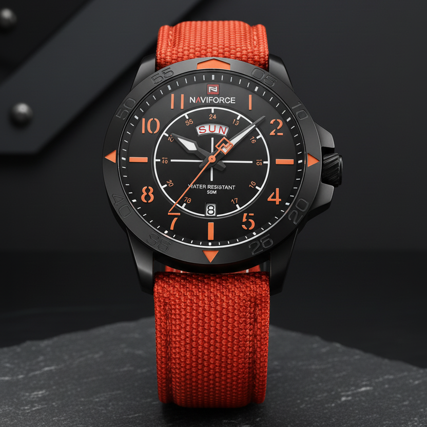 El Naviforce Crimson Trail fusiona potencia y precisión en un diseño deportivo inconfundible. Su caja negra mate con detalles naranjas y correa textil roja ofrece carácter, resistencia y estilo activo. Ideal para hombres que buscan rendimiento y presencia en cada aventura.