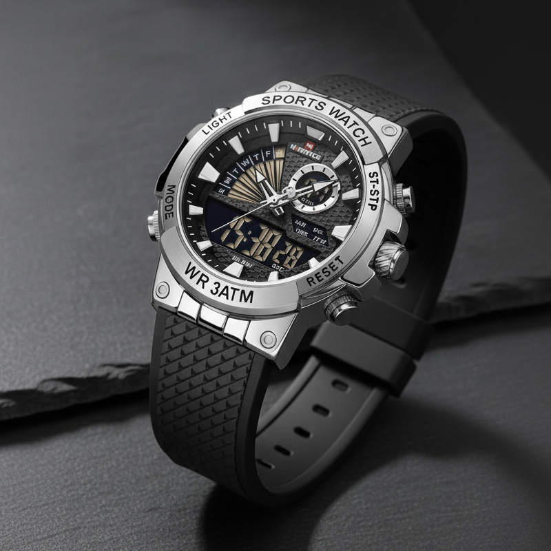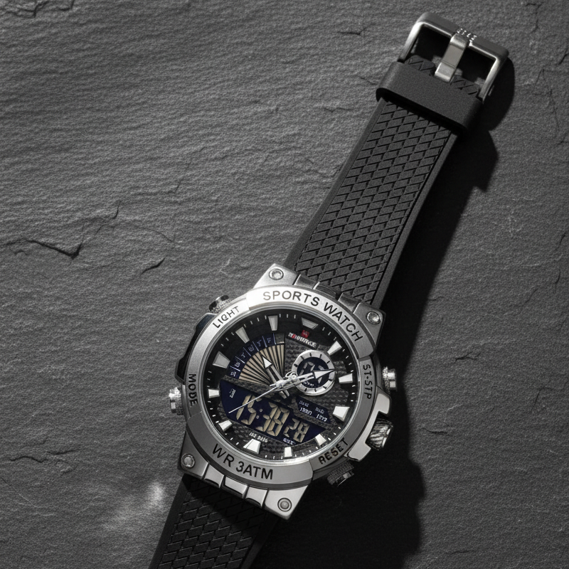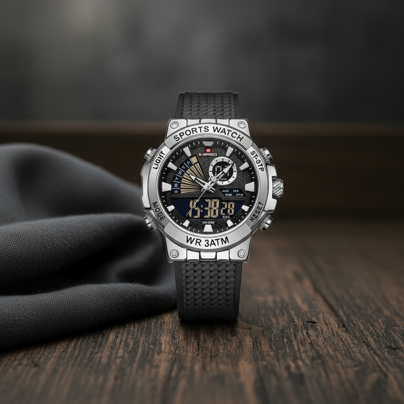 El Naviforce Draxion es un reloj deportivo para hombres que buscan potencia, estilo y máxima funcionalidad. Su estructura reforzada y su correa de silicona lo hacen ideal para la rutina diaria, entrenamientos y aventuras al aire libre.