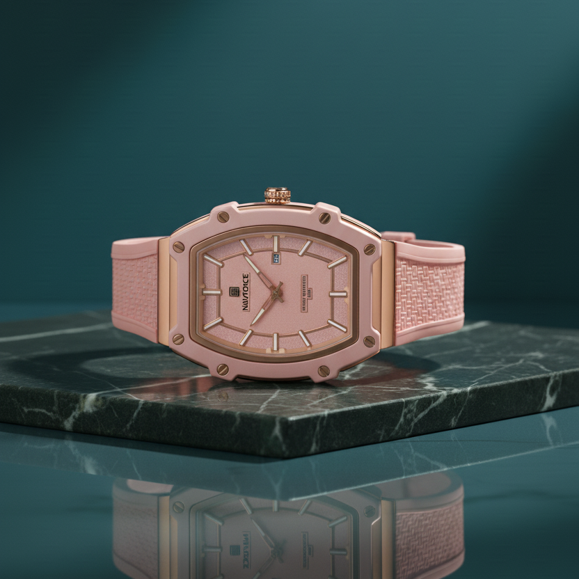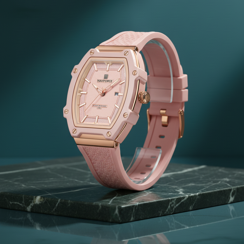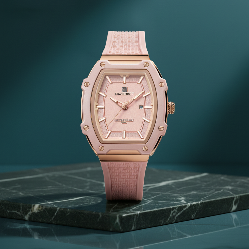 Naviforce Aurora Edge combina elegancia moderna y actitud urbana en un solo diseño. Su caja geométrica y su correa de silicona texturizada crean una pieza sofisticada y versátil, perfecta para mujeres que valoran tanto el estilo como la comodidad.