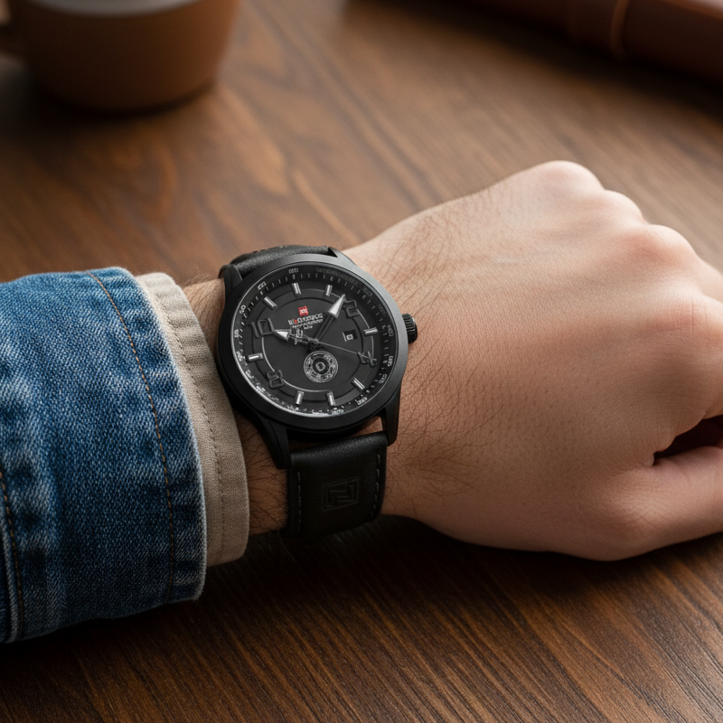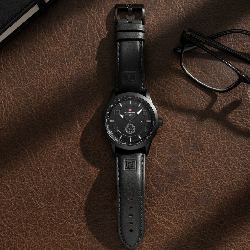 El Naviforce Onyx fusiona elegancia y solidez en un diseño atemporal. Su correa de cuero y su caja metálica lo convierten en el compañero perfecto para el hombre moderno.