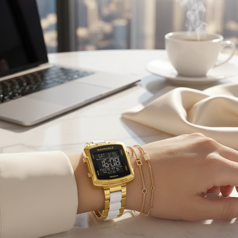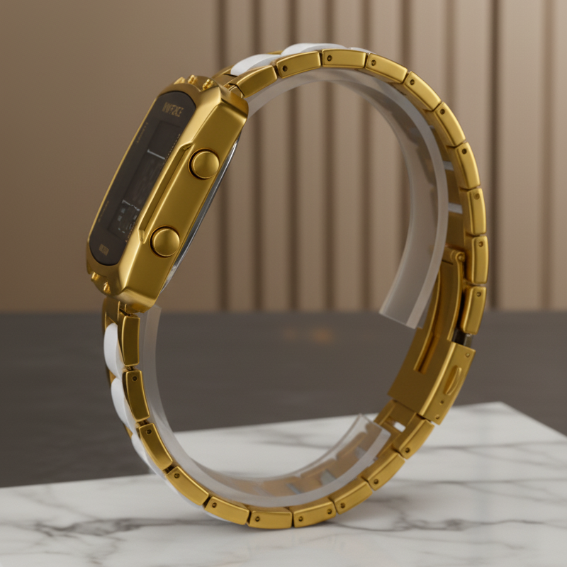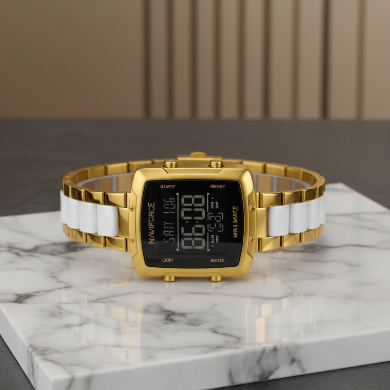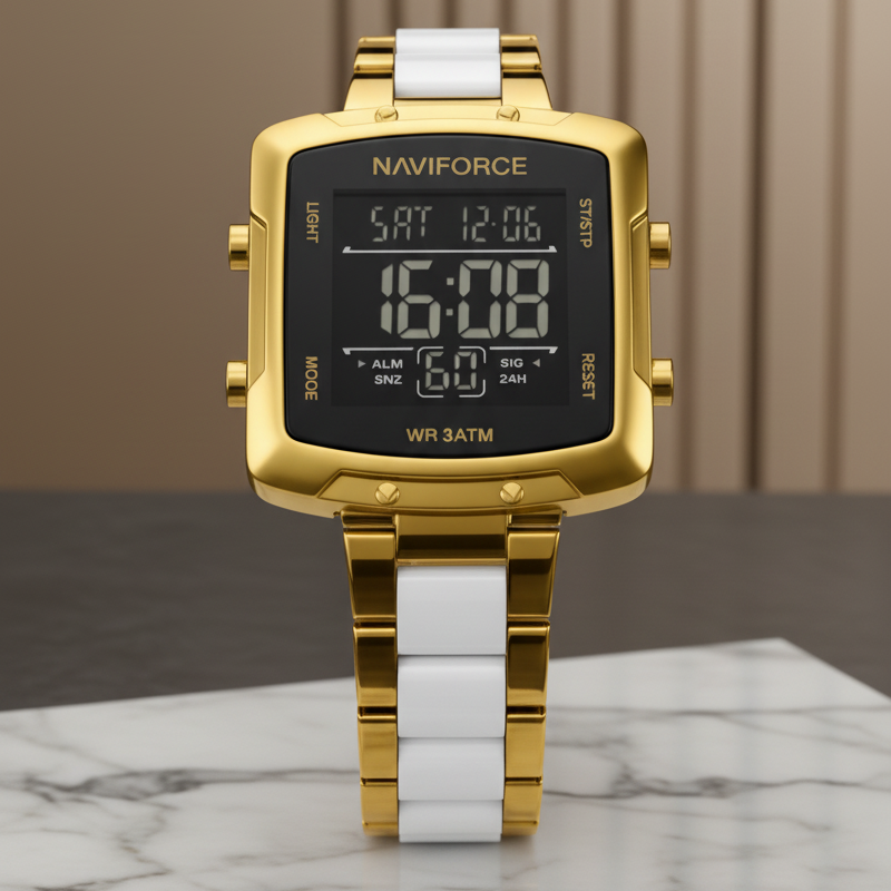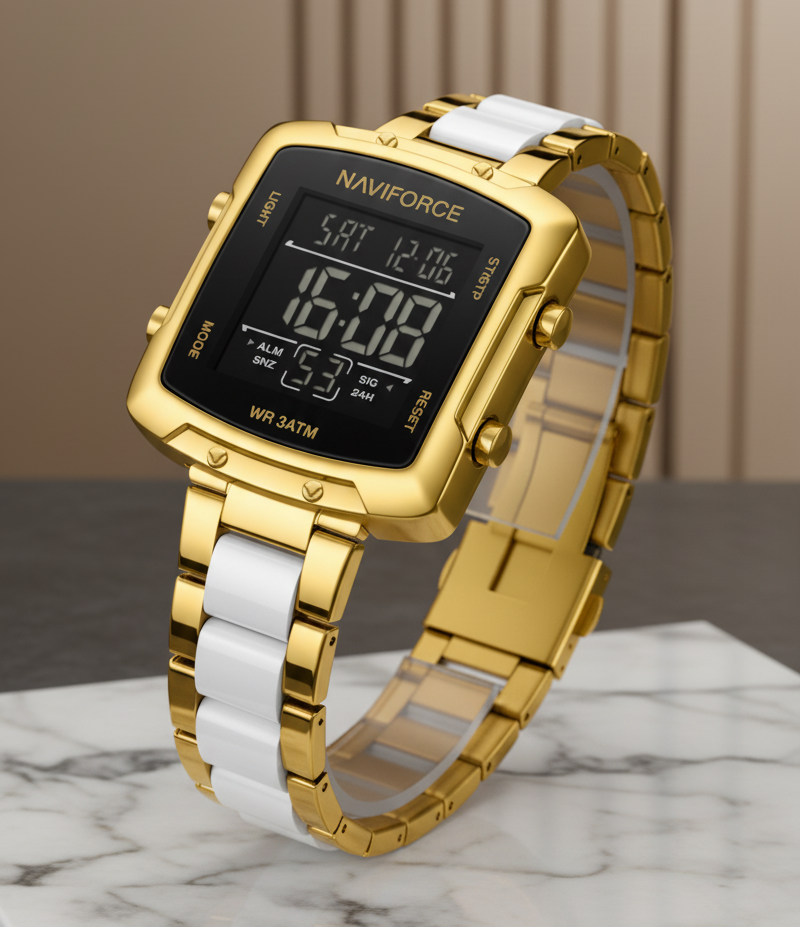 Reloj digital Naviforce Pixel Royale para mujer con diseño cuadrado moderno en acabado dorado de alta calidad y correa bicolor en acero y cerámica. Pantalla digital multifunción con hora, fecha, alarma y cronómetro. Resistencia al agua 3ATM y estilo premium que mezcla moda y tecnología. Ideal para mujeres que buscan un reloj sofisticado, funcional y con estética futurista.