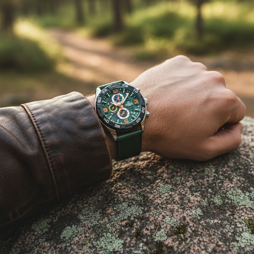 El Naviforce Racer Spirit combina elegancia y energía deportiva. Su correa de cuero y esfera técnica con múltiples indicadores crean una pieza sofisticada, dinámica y con personalidad.