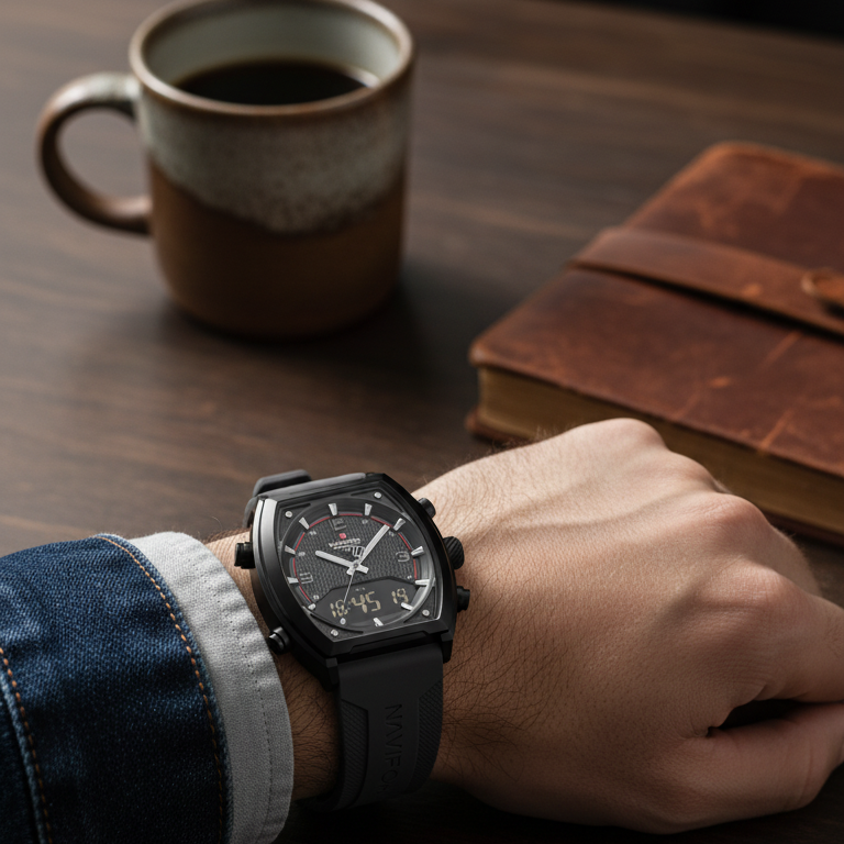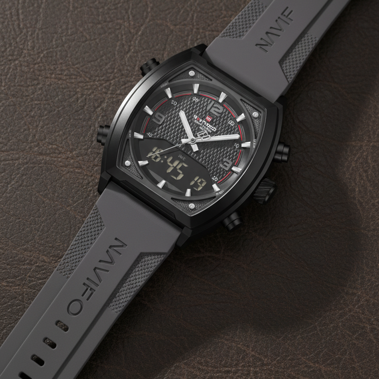 El Naviforce Ravitek es un reloj deportivo diseñado para hombres que buscan resistencia, estilo moderno y funciones híbridas. Su diseño sólido y su correa de silicona lo hacen perfecto para el día a día y actividades activas.