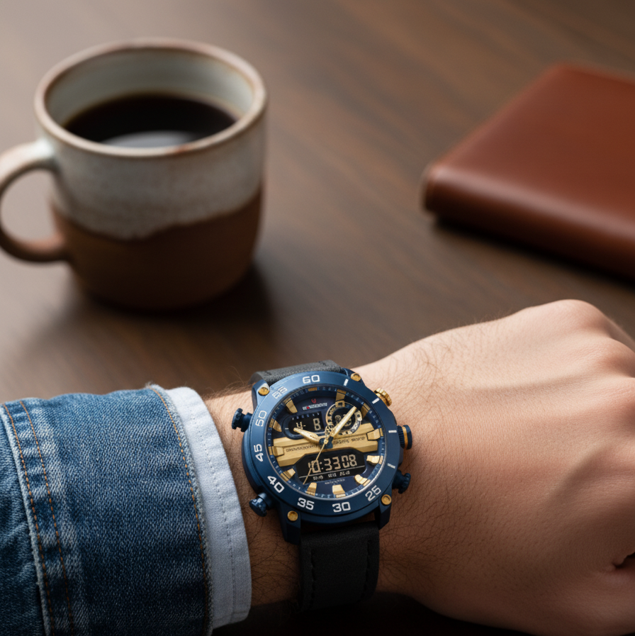 El Naviforce Rexon es un reloj casual y multifuncional diseñado para acompañarte en cualquier momento. Su estilo robusto, pantalla híbrida analógica-digital y detalles de precisión lo convierten en un modelo confiable y versátil para el día a día.