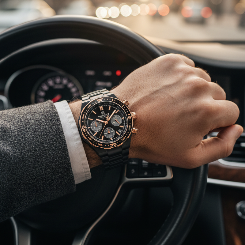 El Naviforce Shadow Chrono fusiona estilo y precisión en un diseño de alto contraste. Su estructura de acero negro con detalles en oro rosado transmite poder y elegancia. Un reloj que destaca por su carácter moderno, su funcionalidad y su impecable presencia.