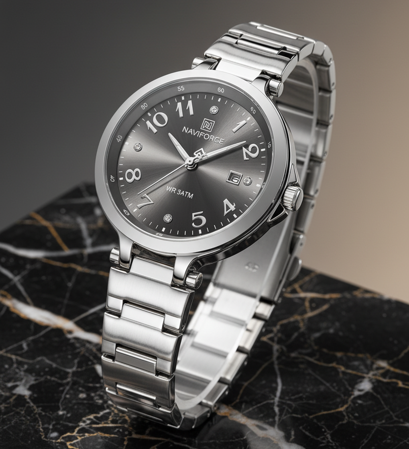Naviforce Silver Aura es un reloj elegante diseñado para mujeres que buscan un accesorio versátil, sofisticado y con acabado de lujo. Su esfera metálica satinada con índices brillantes aporta un toque moderno y refinado, mientras que su correa de acero inoxidable lo convierte en una pieza duradera y atemporal.