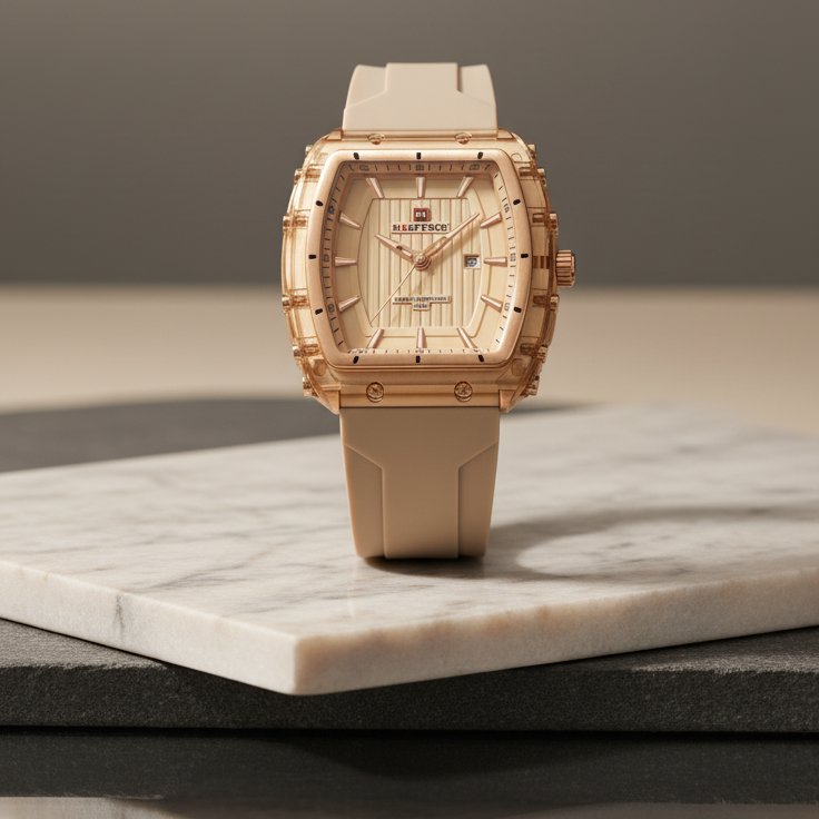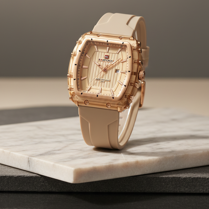 Naviforce Vanguard Terra es un reloj femenino con diseño imponente y vanguardista, creado para mujeres que buscan un accesorio diferente, moderno y con personalidad. Su caja angular con detalles industriales combina fuerza visual con elegancia, mientras que su correa en silicona premium lo hace cómodo, ligero y perfecto para uso diario.