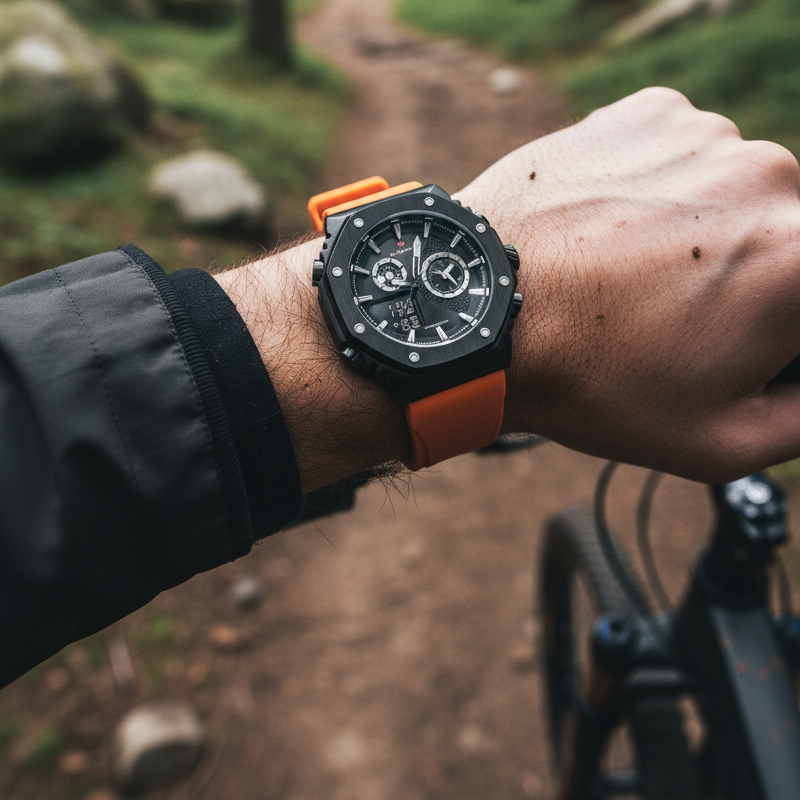 El Naviforce Vortex Edge destaca por su diseño atrevido y moderno. Su caja negra con tornillos metálicos y correa de silicona naranja crea un contraste vibrante que fusiona estilo y funcionalidad. Un reloj pensado para hombres con energía y carácter.