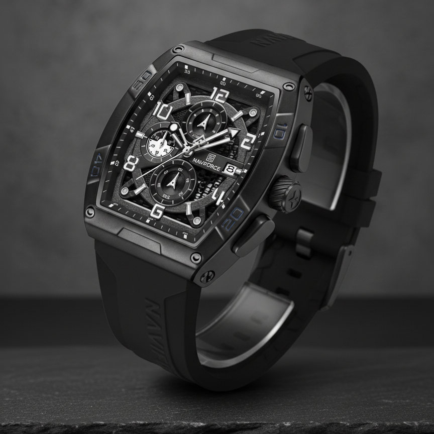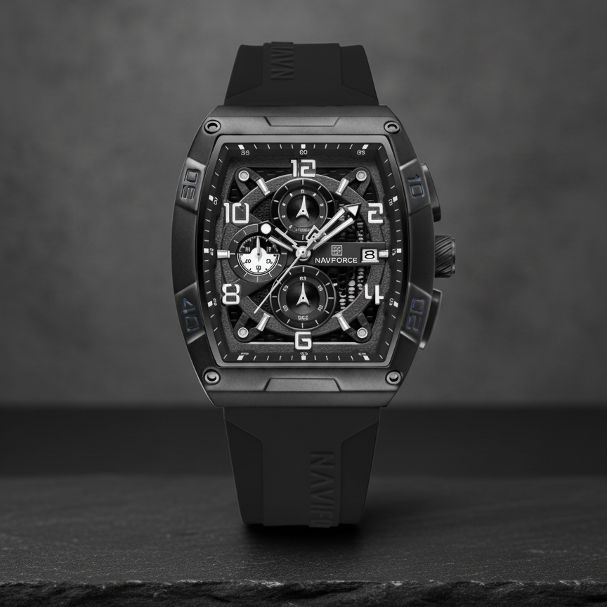 El Naviforce Vorvian es un reloj casual para hombre con un diseño robusto y moderno. Su caja rectangular curva y su correa de silicona crean una estética distintiva, perfecta para quienes buscan estilo y funcionalidad en un solo accesorio.