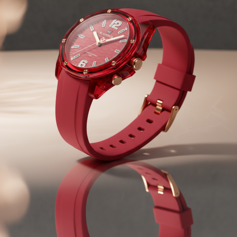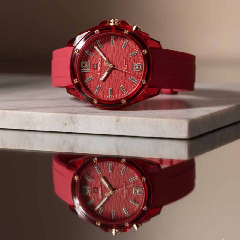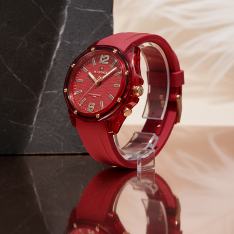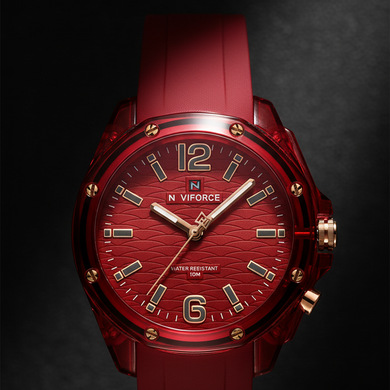 Reloj casual Naviforce Rogue Edition para mujer con diseño monocromático en rojo, correa de silicona resistente y caja texturizada tipo resina premium. Esfera con detalles metálicos y numeración luminosa, ideal para un look urbano, activo y moderno. Movimiento de cuarzo preciso y resistencia al agua 3ATM, perfecto para uso diario y actividades al aire libre.